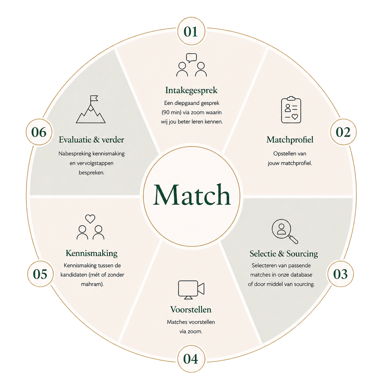We starten met het selecteren van passende matches op basis van jouw match-profiel. Als we in onze database geen geschikte kandidaten vinden, breiden we onze zoektocht uit binnen ons netwerk en maken we gebruik van sourcing. Ons doel is om de best mogelijke match voor jou te vinden, zodat je een betekenisvolle en blijvende relatie kunt opbouwen.